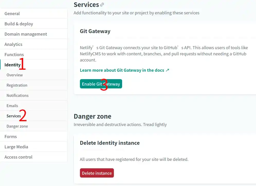 在你的Oerview页面顶部导航那点击identity,点击Enable identity,然后点击Invite users。 写上你自己的邮箱并确认,过一会你的邮箱就会收到netlify的邮件,标题为"You’ve been invited to join(项目名称)",点击Accept the invite即可,这个邮箱接下来可以在admin页面那里用作登陆用的账户名。最多可以绑定的邮箱上限为 5 个。同时,也可以添加使用 github 账号登录的选项。